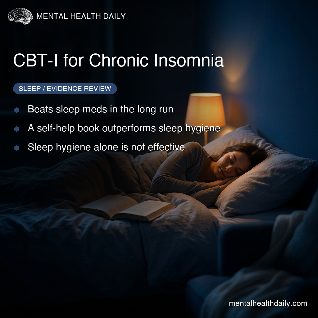 • Self-help versions of CBT-I work. A 2026 Norwegian RCT found that a CBT-I self-help book reduced daily hypnotic use from 25.4% to 18.6% in primary-care patients prescribed sleep medications, and dropped the proportion meeting criteria for anxiety from 32.1% to 23.2%. A pamphlet of sleep hygiene advice did neither.